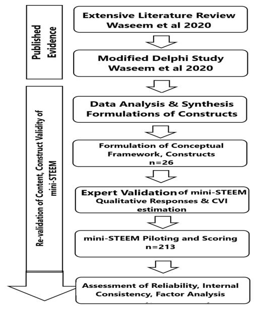 Results: Against previously identified 26 constructs, mini-STEEM items were expert-validated for clarity, relevance, and comprehension. The item content validity index was suboptimal and did not cover all of the dimensions and constructs identified through a previous literature review. Reliability was checked through Cronbach’s alpha (0.779) after piloting through a cohort of students (n=156). Qualitative analysis revealed that mini-STEEM does not cover all of the domains essential for student learning within the OR setting, and does not have adequate representative items to address all elements. Exploratory factor analysis (EFA) showed reasonable loadings; however, the model fitness through confirmatory factor analysis (CFA) was not possible considering low or no representation of most of the themes.